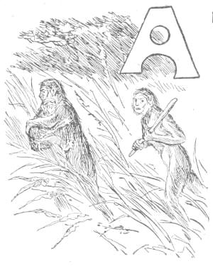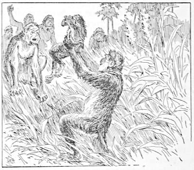 Koree started to the rescue of the woman, but, in the tangled underbrush could not find her; but, instead, he ran against a gigantic ape, which had also been startled by the cries, and, in his fright, was running about in confusion. This ape gave Koree a powerful blow with his fist, and then ran out of the swamp to where the child was playing. Seizing the child he next ran with it into the bushes and was out of sight.