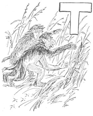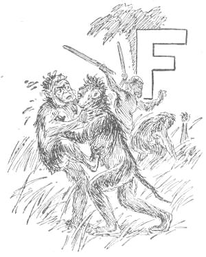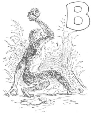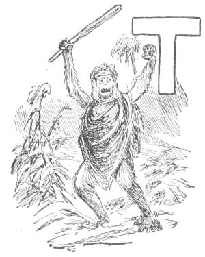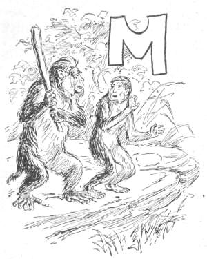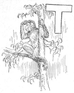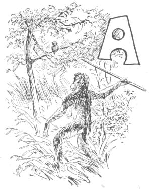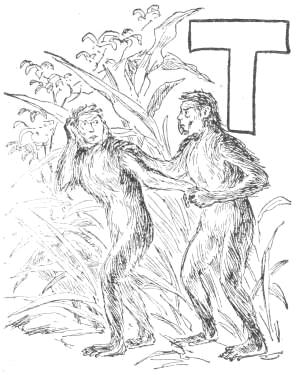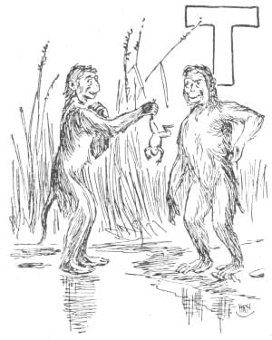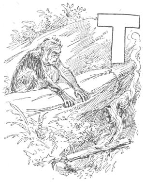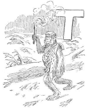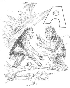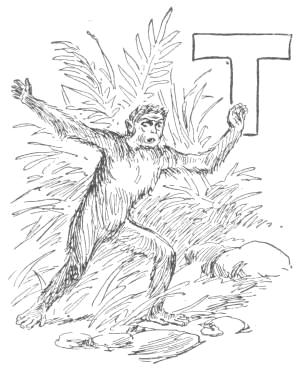 “Tailed Apes, upright Apes, Baboons and Monkeys of low degree: I am tired living on trees. I am getting too old and fat to climb, and cannot go up in the air every time I want to sleep. My eyes are bad, and can’t tell a rotten limb from a sound one. Only two days ago, while eating a cocoanut, the limb broke on which I was sitting, and I fell to the ground, striking a porcupine; and there has been a sick monkey ever since. Just before the big rain I was chased up a tree by a hyena, when, before I got out of reach, he seized my tail, already reduced to a stump, and I had to let go of either the tree or my tail. I stuck to the tree, but to-day I am a tailless Ape! Why should the ground be conceded to tigers and snakes? The earth was made for monkeys. Our food is mostly on the ground, and it is easier to walk on a level than up and down. We can run faster than[16] we can climb. We cannot fly, like the birds, and there is no easy way for such big folks to get up a tree. But we dare not come to the ground. If we do we must fight some brute. The tigers want the earth; and we can’t afford to maintain perpetual war. I am, therefore, for peace, and so favor killing off our enemies. If the forces of the trees will but combine, dropping their disputes about the milk that is in the cocoanut, they can conquer the forces of the earth. Resolve, then, monkeys all, to make a fight for the land, and not be so often found up a stump. True to your ape-hood, join me in an oath to drive out the ground-beasts. Everything in this valley will then be ours. We shall have the plants and berries, and frogs, and little fishes. We can then lie down to sleep without falling off, and run about without getting tired. Whoever loves monkeykind will, therefore, follow my advice. Now, all of you who are resolved to drive out the beasts which claim this land, swear with me by scratching your top rib while I crack this butternut and eat the kernel.”