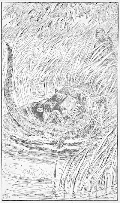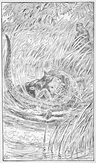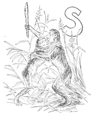 Dropping the berries and uttering a wild scream, she seized the serpent, and, sinking her nails and teeth in its flesh, began a fatal struggle with it. The snake, which had fastened one coil about her leg, swung round violently with the intention of encircling her waist. Her screams startled the child, which began crying, and the two noises attracted the attention of Koree, the lover of Sosee, who was sporting in a puddle near by.