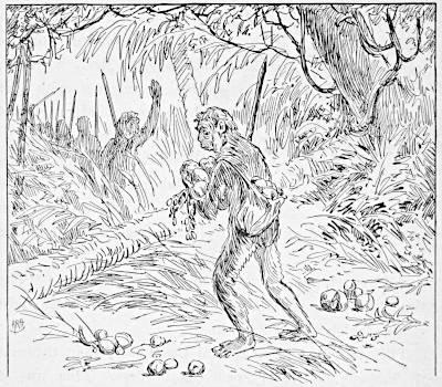 The snakes, however, soon attacked these homes, and all the more eagerly because of the food stored in them. For the Apes found that they could put their structures to many uses not before known. They would hold their provisions, as well as themselves, and would protect such provisions from the weather, as well as from the snakes, and so preserve them for a longer time. Their homes accordingly became store-houses, and this facility for keeping provisions by storage stimulated the collection of them. Instead of gathering only what they wanted to eat at the time, the Apes now picked up all they could find, and placed it in their dug-outs. They soon learned to allow nothing to go to waste, and became economical. They even collected when they did not want anything, from the mere fact that they could store it, and thus[30] became provident. They believed they might want in the future, and so often stored large quantities; for some Apes early became avaricious. They got in time to be as proud of their possessions as of their homes, and often gathered from a feeling of ambition. Shoozoo claimed that he had enough fruits in his mound to feed all the Apes of Cocoanut Hill for a lifetime; which nobody of that generation believed, and nobody of the next doubted.