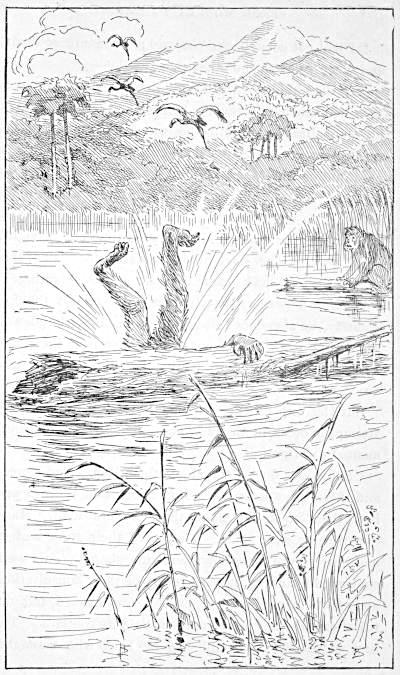 No time was to be lost, and, before the words of the timid ape were fully uttered, Shamboo dropped upon the tiger. His great weight crushed the beast to the ground, and compelled it to let go of the sheep. The tiger immediately got up, however, and, not knowing what to do, in his embarrassment, started on a full run. Shamboo clung to his back, and away they both went, like John Gilpin, dashing over hill and dale and through jungle and forest. The deer fled at their approach, squirrels ran up the trees, a flock of ducks started from a pool near by, and the flight of birds and beasts from their path was like the stampede which precedes a prairie fire. Shamboo’s teeth were fixed in the tiger’s neck, and his feet like spurs were sunk in his sides.