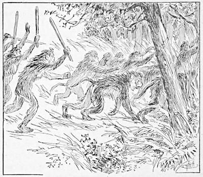 The Apes also broke off branches of trees, with which they pounded the savage beasts, not only by throwing them from the trees as missiles, but by using them as clubs, until they became skilled in the art of pounding, as well as of making clubs. When catamounts, bears and other climbing beasts attacked them on the trees, and fought paw to paw with them, they used the stones as knives, and often cut their assailants fatally, having learned to select sharp stones for this purpose, and, in time, to sharpen them specially. Before the war they had used stones only to crack nuts. But now they learned both to use them for many other purposes, and to make them into the size and shape which best suited them.