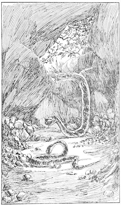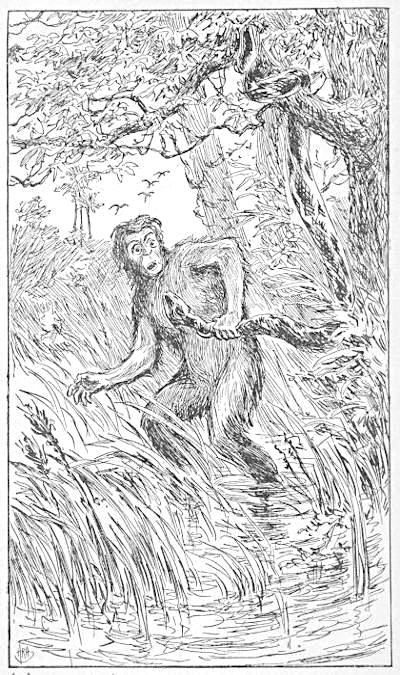 After the savage beasts had been driven from the region of Cocoanut Hill, and the Apes had come down from the trees, and were habitually on the ground, they found themselves encountering new dangers. The snakes were troublesome. The snakes had, indeed, been troublesome before, but it was mainly when they climbed the trees for birds’ nests or fruits. The Apes did not then encounter them so often, and amid the greater dangers from the four-footed beasts, did not find it necessary to make war against them. But now, when the Apes walked more on the ground, they met the snakes oftener, and under more disagreeable circumstances. The snakes, moreover, had greatly multiplied since the destruction of the savage beasts, many of which devoured, or fought with, snakes, or else lived on the same food. With the departure, accordingly, of the enemies of the serpents, and their increase of sustenance, the serpents became powerful, and at last threatened to drive the Apes from the region. It became dangerous to walk abroad, especially[29] near the Swamp. At night they disturbed the slumbers of the Apes. Shoozoo declared that he once found two in his ear when he awoke, and that he had swallowed some big ones during the night, although Shamboo declared contemptuously that he only had worms.