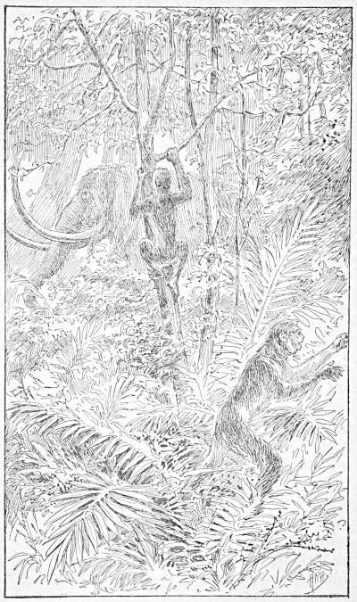The Apes of all kinds had, till then, been roving promiscuously over the country along with wild beasts of every description. The forests being free to all, and likewise the swamps, there was a scene like that of the jungles of Central Africa to-day. Land and water teemed with life, and were animated with struggles for the food of the region. Gigantic lions, tigers, woolly rhinoceroses, mastodons, cave-bears and other savage beasts sported in their favorite element. Serpents were particularly abundant, especially in the great Alligator Swamp, from which they emerged to the high country to catch rabbits and other game. The Apes, which were mostly vegetarians, did not at first interfere[14] with the more savage beasts hunting in these forests; so that there was an endless variety of animals in the region of which we speak.