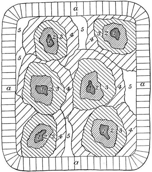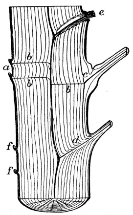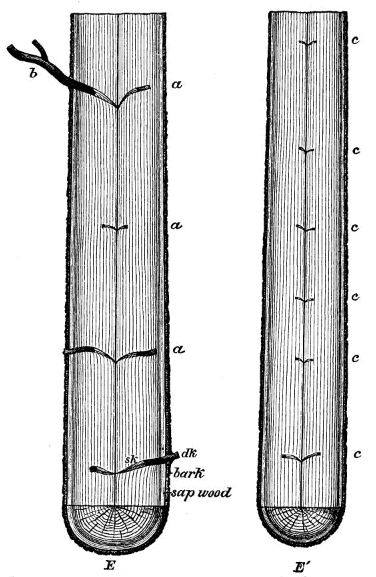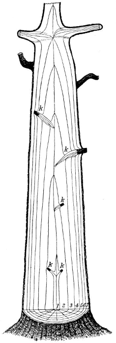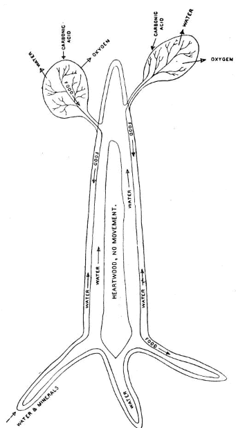 Trees derive their food and solid substance in part from the air and in part from the soil. The solid part of their bodies is made up of cellulose, which consists largely of carbon (44 per cent of its weight), with hydrogen and oxygen added in almost the same proportions as in water. The carbon is derived from the carbonic acid of the air, which « 4 » enters into the leaves and, under the influence of light, air, and water, is there decomposed; the oxygen is exhaled; the carbon is retained and combined with elements derived from the water, forming compounds, such as starch, sugar, etc., which are used as food materials, passing down the tree through its outer layers to the very tips of the roots, making new wood all along the branches, trunk, and roots.