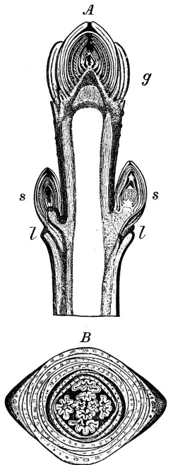 The water, with the minerals in solution, is taken up by the roots when the soil is warm enough, but to enable the roots to act they must be closely packed with the soil. It is conveyed mostly through the outer, which are the younger, layers of the wood of root, trunk, and branches to the leaves. Here, as we have seen, under the influence of light and heat it is in large part transpired and in part combined with the carbon into organic compounds, sugar, etc., which serve as food materials. These travel from the leaf into the branchlet, and down through the outer layers of the trunk to the very tips of the root, forming new wood all the way, new buds, which lengthen into shoots, leaves, and flowers, and also new rootlets. To live and grow, therefore, the roots need the food elaborated in the leaves, just as the leaves need the water sent up from the roots.