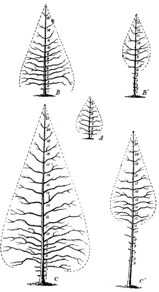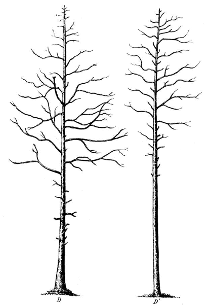 All trees ultimately thrive best—i. e., grow most vigorously—in the full enjoyment of light, but their energy then goes into branching. Crowded together, with the side light cut off, the lower lateral branches soon die and fall, while the main energy of growth is put into the shaft and the height growth is stimulated. The denser shade of the shade-enduring kinds, if placed as neighbors to light-needing ones, is most effective in producing this result, provided that the light is not cut off at the top; and thus, in practice, advantage is taken of the relative requirements for light of the various species.[1]