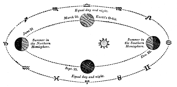 The axis of the earth is not perpendicular while the earth is revolving round the sun, but slanting, as is seen in the cut above. Whilst the earth is passing between the points marked March 20, and Sept. 23, the north pole inclines toward the sun, and then the northern hemisphere enjoys more of his rays than the southern. Consequently it is the warm season in the northern, and the cold season in the southern hemisphere; and from 23d Sept. to 20th March, as the south pole is toward the sun, it is the warm season in the southern, and the cold season in the northern hemisphere.