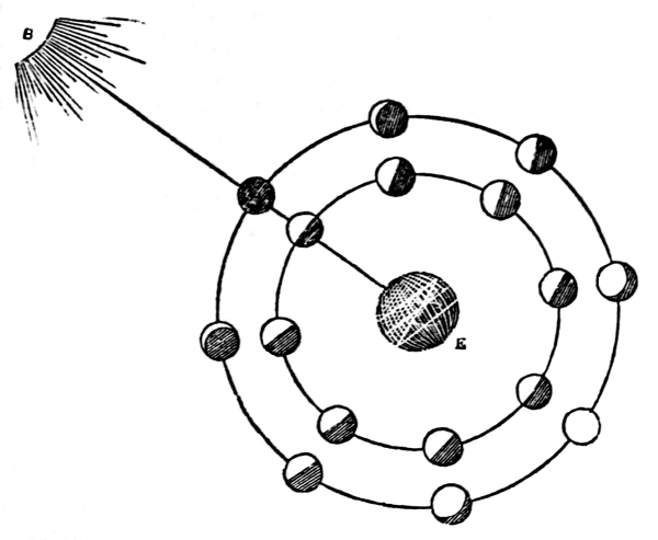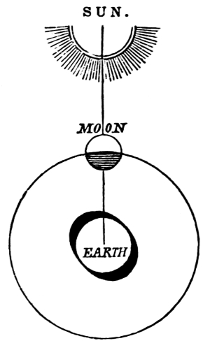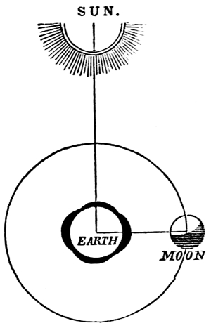 When the moon is on the side of the earth opposite to the Sun, the whole bright side of the moon is toward the earth, and it is then full moon; but when the Sun and moon are on the same side of the earth, the dark side of the moon is toward the earth, and it is new moon. [Pg 77]