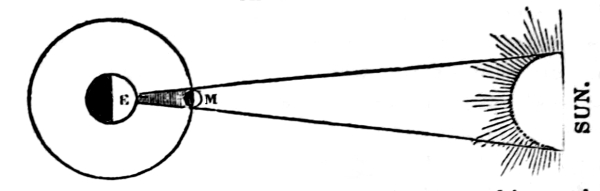 The moon being an opaque body, does not shine, when by any cause the rays of the Sun are prevented from reaching her surface. Thus when the moon arrives in her orbit at a point where the rays of the Sun are intercepted by the earth, she is in the shadow of the earth, and is not enlightened by the Sun. Therefore;