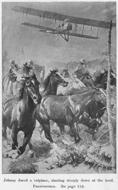 By that time she was out on the porch, where she was immediately joined by her father and mother, also awakened by the motor. They were just in time. From the neighborhood of the corral came an increasing roar. A sudden rush of cool morning wind brought dust and bits of hay and gravel flying in a cloud. A great, wide-winged, teetering bird-thing went racing out into sight, spurned the earth and lifted, climbed steadily, circling like a hungry hawk over a meadow full of mice.