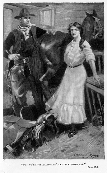 "Too bad your horse fell," he remarked stupidly, gathering up the handful of shavings he had whittled from a piece of pine board. "I always hate to see a horse get hurt." It was not what he had wanted to say, but he could not seem to put just the right thing into words. What he wanted was to make her feel that there was nothing out of the ordinary in her being there, and that he was helpful and sympathetic without being in the least surprised. In all his life on the range he had never had a young woman walk into a line-camp at dusk—a strange young woman who tried pitifully to be at ease and whose eyes gave the lie to her manner—and he groped confusedly for just the right way in which to meet the situation.