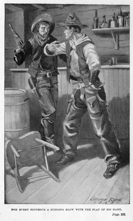 "Yuh don't know of any quarrel between you and me? Yuh say yuh don't?" Billy's voice trembled a little, because of the murder-lust that gripped him. "Well, pretty soon, I'll start in and tell yuh all about it—maybe. Right now, I'm going t' give a new one—one that yuh can easy name and do what yuh damn' please about." Whereupon he did as he had done once before when the offender had been a sheepherder. He stepped quickly to one side of the Pilgrim, emptied a glass down inside his collar, struck him sharply across his grinning mouth, and stepped back—back until there were eight or ten feet between them.
