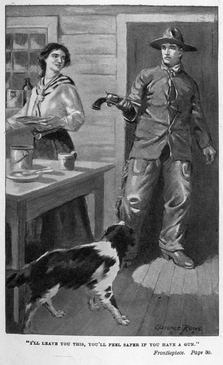 "I'll leave you this," he remarked, with an awkward attempt to appear careless. "You'll feel safer if you have a gun, and—and if you're scared at anything, shoot it." He finished with another smile that lighted wonderfully his face and his eyes.
