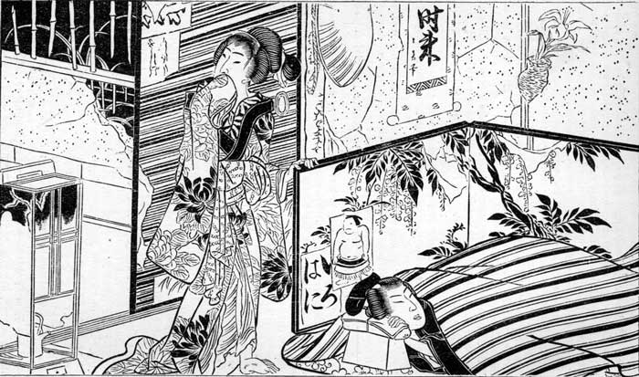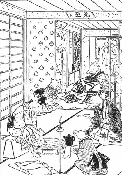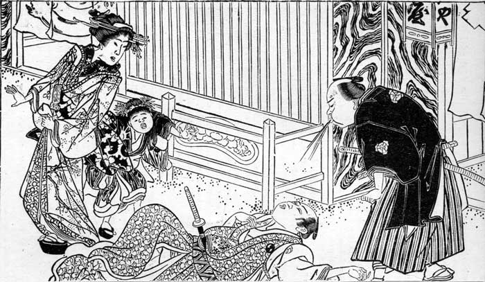 One day Kuranosuké's wife, who was bitterly grieved to see her husband lead this abandoned life, went to him and said: "My lord, you told me at first that your debauchery was but a trick to make your enemy relax in watchfulness. But indeed, indeed, this has gone too far. I pray and beseech you to put some restraint upon yourself."