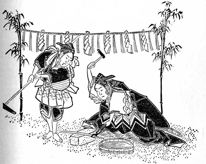 Footnote 41: (return)Sukésada, a famous family of swordsmiths, belonging to the Bizen clan. The Bizen men are notoriously good armourers, and their blades fetch high prices. The sword of Jiuyémon is said to have been made by one of the Sukésada who lived about 290 years ago.