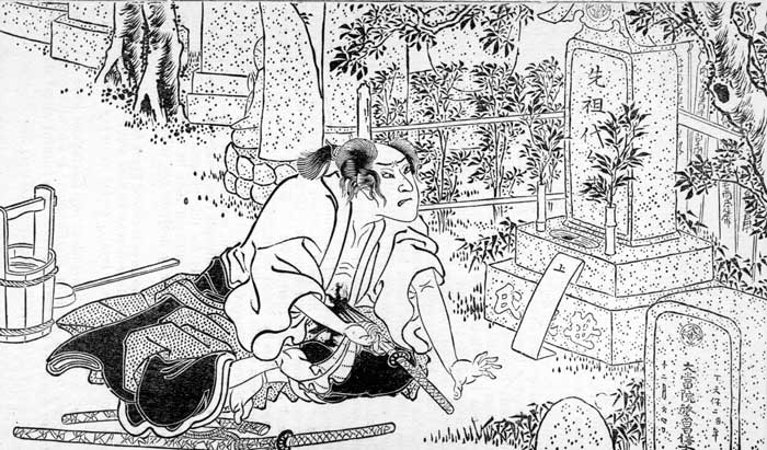 Then there arose a great uproar and confusion, and Takumi no Kami was arrested and disarmed, and confined in one of the apartments of the palace under the care of the censors. A council was held, and the prisoner was given over to the safeguard of a daimio, called Tamura Ukiyô no Daibu, who kept [pg 7] him in close custody in his own house, to the great grief of his wife and of his retainers; and when the deliberations of the council were completed, it was decided that, as he had committed an outrage and attacked another man within the precincts of the palace, he must perform hara-kiri,—that is, commit suicide by disembowelling; his goods must be confiscated, and his family ruined. Such was the law. So Takumi no Kami performed hara-kiri, his castle of Akô was confiscated, and his retainers having become Rônins, some of them took service with other daimios, and others became merchants.