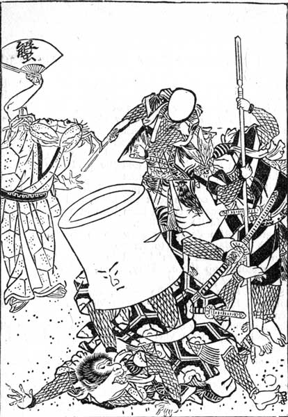 So Oishi Kuranosuké and his forty-six companions began to lay their plans of vengeance against Kôtsuké no Suké; but the latter was so well guarded by a body of men lent to him by a daimio called Uyésugi Sama, whose daughter he had married, that they saw that the only way of attaining their end would be to throw their enemy off his guard. With this object they separated and disguised themselves, some as carpenters or craftsmen, others as merchants; and their chief, Kuranosuké, went to Kiôto, and built a house in the quarter called Yamashina, where he took to frequenting houses of the worst repute, and gave himself up to drunkenness and debauchery, as if nothing were further from his mind than revenge. Kôtsuké no Suké, in the meanwhile, suspecting that Takumi no Kami's former retainers would be scheming against his life, secretly sent spies to Kiôto, and caused a faithful account to be kept of all that Kuranosuké did. The latter, however, determined thoroughly to delude the enemy into a false security, went on leading a dissolute life with harlots and winebibbers. One day, as he was returning home drunk from some low haunt, he fell down in the street and went to sleep, and all the passers-by laughed him to scorn. It happened that a Satsuma man saw this, and said: "Is not this Oishi Kuranosuké, who was a councillor of Asano Takumi no Kami, and who, not having the heart to avenge his lord, gives himself up to women and wine? See how he lies drunk in the public street! Faithless beast! Fool and craven! Unworthy the name of a Samurai!"5