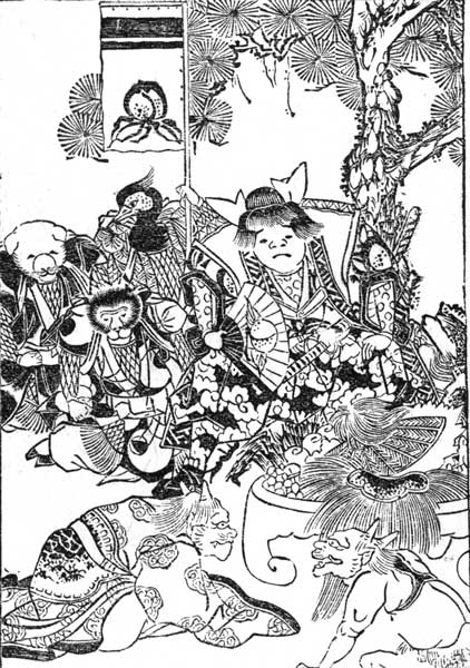 Footnote 116: (return)In the island of Takasago, in the province of Harima, stands a pine-tree, called the "pine of mutual old age." At the root the tree is single, but towards the centre it springs into two stems—an old, old pine, models of which are used at weddings as a symbol that the happy pair shall reach old age together. Its evergreen leaves are an emblem of the unchanging constancy of the heart. Figures of an old man and woman under the tree are the spirits of the old pine.