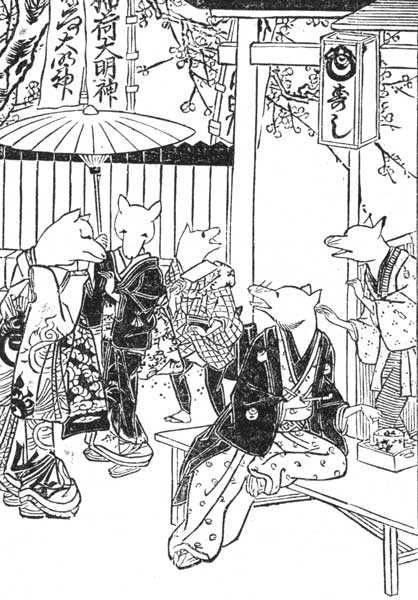 Footnote 79: (return)Inari Sama is the title under which was deified a certain mythical personage, called Uga, to whom tradition attributes the honour of having first discovered and cultivated the rice-plant. He is represented carrying a few ears of rice, and is symbolized by a snake guarding a bale of rice grain. The foxes wait upon him, and do his bidding. Inasmuch as rice is the most important and necessary product of Japan, the honours which Inari Sama receives are extraordinary. Almost every house in the country contains somewhere about the grounds a pretty little shrine in his honour; and on a certain day of the second month of the year his feast is celebrated with much beating of drums and other noises, in which the children take a special delight. "On this day," says the Ô-Satsuyô, a Japanese cyclopædia, "at Yedo, where there are myriads upon myriads of shrines to Inari Sama, there are all sorts of ceremonies. Long banners with inscriptions are erected, lamps and lanterns are hung up, and the houses are decked with various dolls and figures; the sound of flutes and drums is heard, the people dance and make holiday according to their fancy. In short, it is the most bustling festival of the Yedo year."