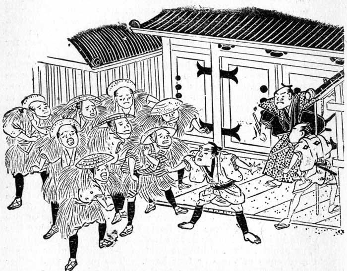 SÔGORÔ THRUSTING THE PETITION INTO THE SHOGUN'S LITTER