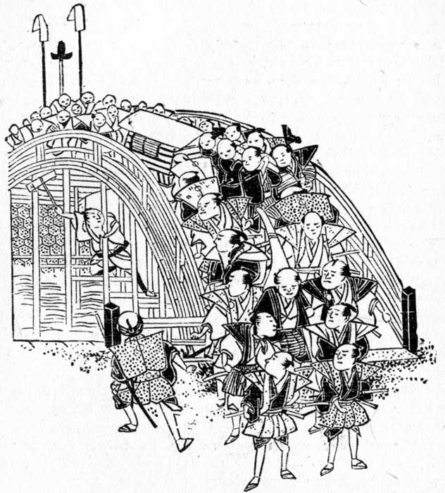 At the beginning of the eighteenth century there lived a daimio, called Asano Takumi no Kami, the Lord of the castle of Akô, in [pg 4] the province of Harima. Now it happened that an Imperial ambassador from the Court of the Mikado having been sent to the Shogun3 at Yedo, Takumi no Kami and another noble called Kamei Sama were appointed to receive and feast the envoy; and a high official, named Kira Kôtsuké no Suké, was named to teach them the proper ceremonies to be observed upon the occasion. The two nobles were accordingly forced to go daily to the castle to listen to the instructions of Kôtsuké no Suké. But this Kôtsuké no Suké was a man greedy of money; and as he deemed that the presents which the two daimios, according to time-honoured custom, had brought him in return for his instruction, were mean and unworthy, he conceived a great hatred against them, and took no pains in teaching them, but on the contrary rather sought to make laughing-stocks of them. Takumi no Kami, restrained by a stern sense of duty, bore his insults with patience; but Kamei Sama, who had less control over his temper, was violently incensed, and determined to kill Kôtsuké no Suké.