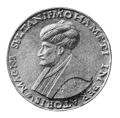 From a medallion in the British Museum attributed to the Italian artist Gentile Bellini, who was invited by Mahomet to Constantinople, in 1480, and painted a portrait of him.