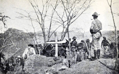 At Marendellas (fifty–one miles from Salisbury) we passed one of the fortified road posts, where we saw the graves of poor Evans, Barnes, and Morris, and of several men, all killed in action in the neighbourhood. At Headlands (eighty–eight miles) and Fort Haynes (a hundred and five miles), similar forts, were more such graves, including that of Captain Haynes, R.E., and others killed in the attack on Makoni’s.