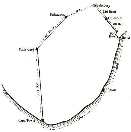 In 1889 Colonel Pennefather’s “trek” of “pioneers” took up Mashonaland for the Chartered[472] Company, along the northern face of the Transvaal.