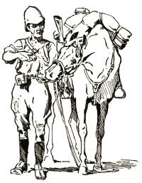 My horse, the sole survivor of four, is picking up flesh rapidly with good grazing and corn, and being well looked after by a soldier servant whom I have got from the Irish company of the mounted infantry. This man, M’Grath, pleased me this morning by describing the horse as a “tedious feeder” (pronounced in the richest brogue)—meaning he was slow in eating his corn.