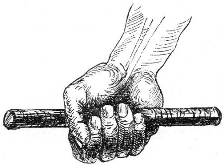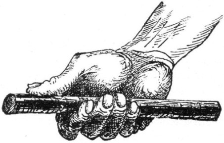 Without wishing to detract from the undoubted merits, in certain special cases, of these very big sticks, I am bound to say that, only being useful to a limited extent, they should not be encouraged. Let the stick you habitually carry be one well within your compass. If it comes up to guard readily and without any apparent effort or straining of your wrist, and if you find you can make all the broadsword cuts, grasping it as shown in Fig. 14, without the least spraining your thumb, then you may be pretty sure that you are not “over-sticked,” and that your cuts and thrusts will be smart to an extent not to be acquired if you carried a stick ever so little too heavy for you.