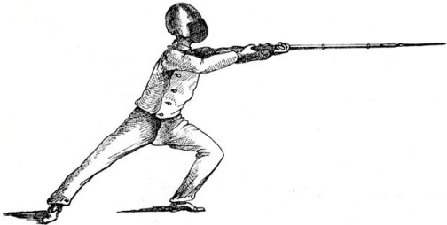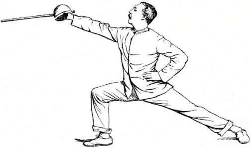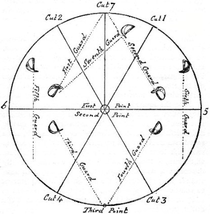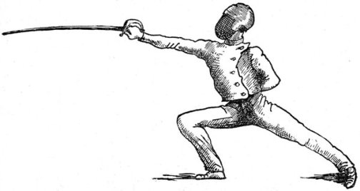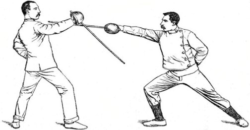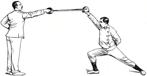The left arm, supplying the place of the targe, alluded to in Scott’s lines, is doubtless an advantage; but, in the case of the two combatants whose merits we are considering, the ordinary swordsman possesses superior reach, can lunge out further, and knows full well the value of the point.