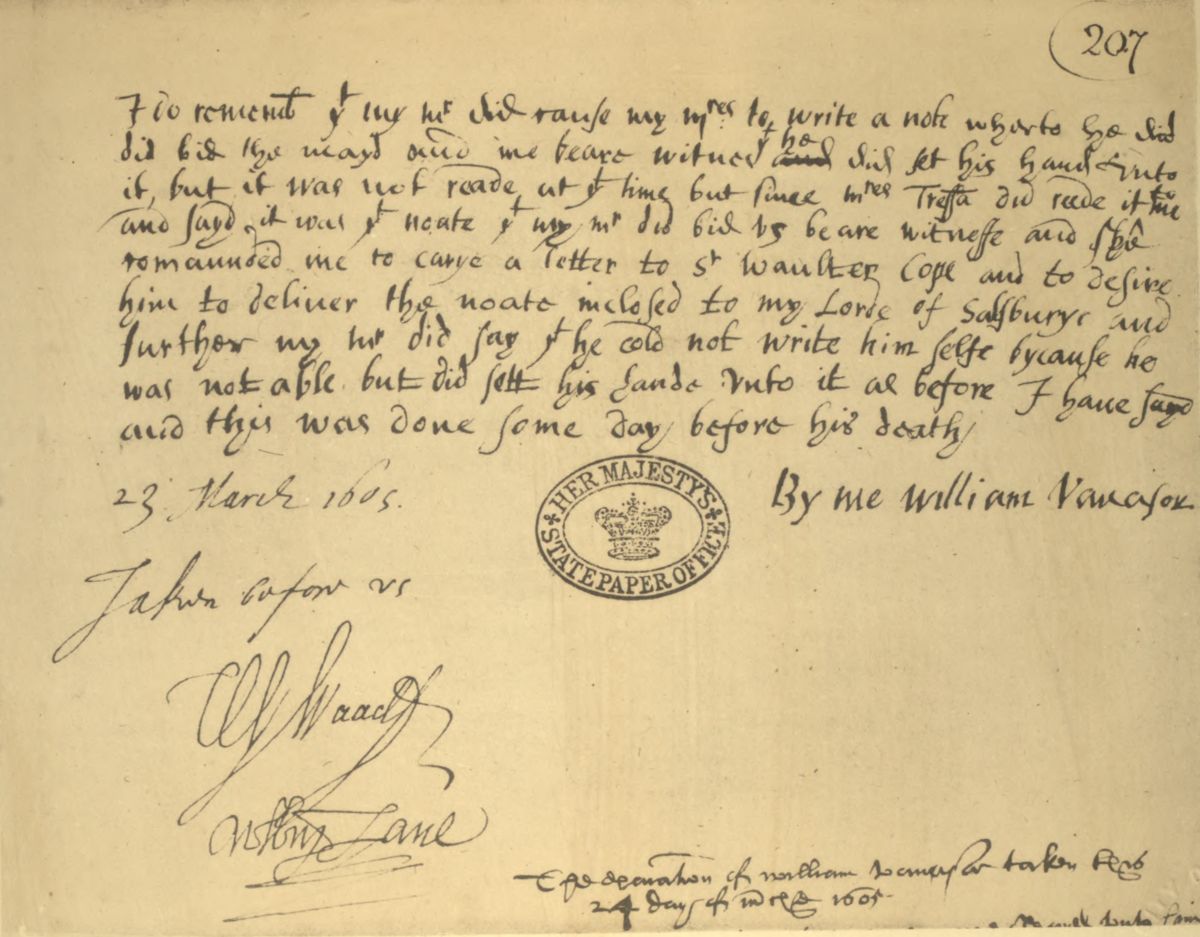 "I do rememb' yt my mr did cause my mres to write a note wherto he did did (sic) bid the mayd and me beare witnes yt he did set his hand unto it, but it was not reade at yt time but since mres Tressa' did reede it to me and sayd it was yt noate yt my mr did bid us beare witnesse and she comaunded me to carye a letter to Sr Waulter Cope and to desire him to deliver the noate inclosed to my Lorde of Salsburye and further my mr did say yt he cold not write him selfe bycause he was not able but he did sett his hande unto it as before I have sayd and this was done some day before his death.