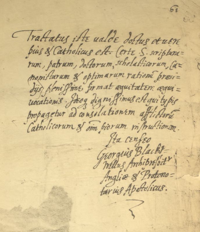 On December 1, 1605, the Attorney-General, while investigating the conspiracy, obtained two MS. volumes which had been found in George Vavasour's chambers in the Inner Temple. One, officially described as a "quarto" volume, though an octavo (8¼ x 5¾), entitled "A Treatise against Lying,"[55] [Pg 26]was stated by George Vavasour, on examination[56] to have been lent him by Francis Tresham to copy,[57] and the copy he had made was contained in the folio, the other MS. found. He denied any knowledge of the handwriting in the "quarto" volume, except that he had recopied the last page (61), in order to replace a torn leaf, bearing in Latin the Imprimatur of George Blackwell, Archpriest of the English Jesuits. William Tresham (Francis Tresham's youngest brother), on being examined by Coke, said that he thought the "quarto" MS. was in William Vavasour's handwriting, who was formerly his father's servant, and since serving his eldest brother in the Tower.[58] William Tresham may have seen Vavasour so employed at home and would know his writing; while George Vavasour might not wish to bring his brother into question. The folio MS. has disappeared, but the "quarto" copy, as ascribed to William Vavasour, is now with[Pg 27] Archbishop Laud's MSS. (No. 655) in the Bodleian Library, and was published in 1851.