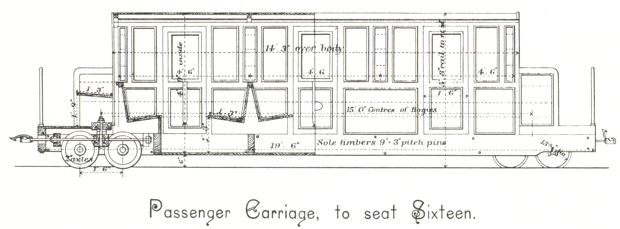 Thirty wagons 6 ft. long, 3 ft. wide, 1 ft. 3 in. deep, weighing each 7½ cwts., and holding 16 to 17 cwts. of coal, or 20 to 22 cwts. of bricks and road metal. The sides are of box form and removable, so that the floors can be used as flat wagons for the conveyance of large stones, castings, &c. Fittings are attachable to any wagon for carrying long timber. Also one bogie passenger car 20 ft. long and 3 ft. 6 in. wide, weighing 23 cwts. and seating 16 persons, and one parcel van, to carry 2 tons, of approximately similar construction.