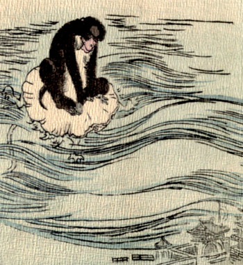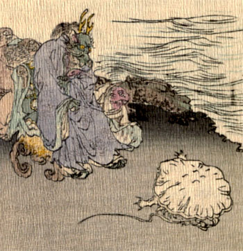 Well, of course the Dragon King did not like to have it thought that he was unkind to his beautiful young wife. So he sent for his trusty [9]servant the Jelly-Fish, and said: “It is rather a difficult job; but what I want you to try to do is to swim across to the land, and persuade a live Monkey to come here with you. In order to make the Monkey willing to come, you can tell him how much nicer everything is here in Dragon-Land than away where he lives. But what I really want him for is to cut out his liver, and use it as medicine for your young Mistress, [10]who, as you know, is dangerously ill.”