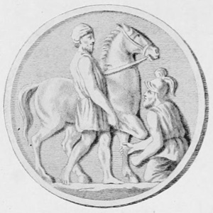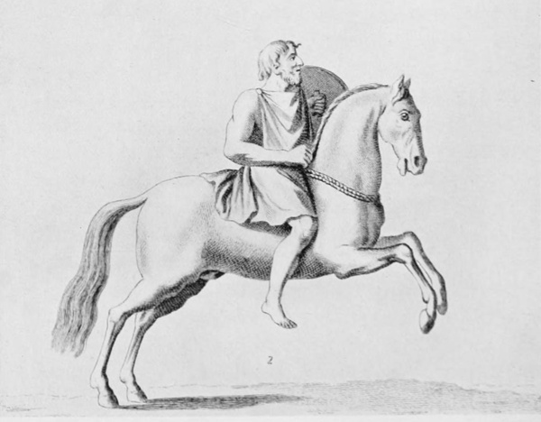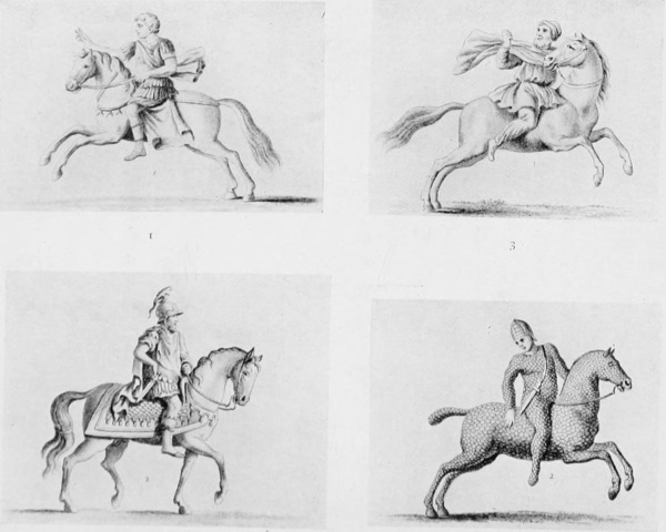 The Emperor Trajan, showing Roman style of riding 2. The Emperor Theodosius, showing saddle 3. A Parthian horseman, showing Parthian style of riding bareback 4. Sarmatian horse and warrior, meant to represent horse and rider in armour made of plates of bone or of horse-hoof |