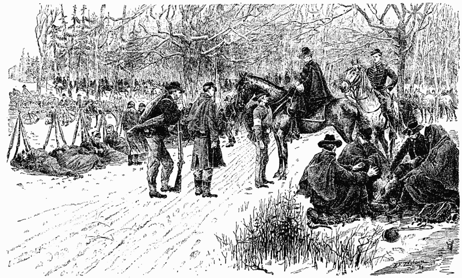 At Webster, the court town of Jackson County, we were quartered for the night in the jail, but accompanied Lieutenant Cogdill to a venison breakfast at the parsonage with Mrs. Harris and her daughter, who had called on us the evening before. Snow had fallen during the night, and when we continued our march it was with the half-frozen slush crushing in and out, at every step, through our broken shoes. Before the close of this dreary New-Year's day we came upon the scene of one of those wild tragedies which are still of too frequent occurrence in those remote regions, isolated from the strong arm of the law. Our road led down and around the mountain-side, which on our right was a barren, rocky waste, sloping gradually up from the inner curve of the arc we were describing. From this direction arose a low wailing sound, and a little farther on we came in view of a dismal group of men, women, and mules. In the center of the gathering lay the lifeless remains of a father and his two sons; seated upon the ground, swaying and weeping over their dead, were the mother and wives of the young men. A burial party, armed with spades and picks, waited by their mules, while at a respectful distance from the mourners stood a circle of neighbors and passers-by, some gazing in silent sympathy, and others not hesitating to express a quiet approval of the shocking tragedy. Between two families, the Hoopers and the Watsons, a bitter feud had long existed, and from time to time men of each clan had fallen by the rifles of the other. The Hoopers were loyal Union men, and if the Watsons yielded any loyalty it was to the State of North Carolina. On one occasion shortly before the final tragedy, when one of the young Hoopers was sitting quietly in his door, a light puff of smoke rose from the bushes and a rifle-ball plowed through his leg. The Hoopers resolved to begin the new year by wiping out their enemies, root and branch. Before light they had surrounded the log cabin of the Watsons and secured all the male inmates, except one who, wounded, escaped through a window. The latter afterward executed a singular revenge by killing and skinning the dog of his enemies and elevating the carcass on a pole in front of their house.