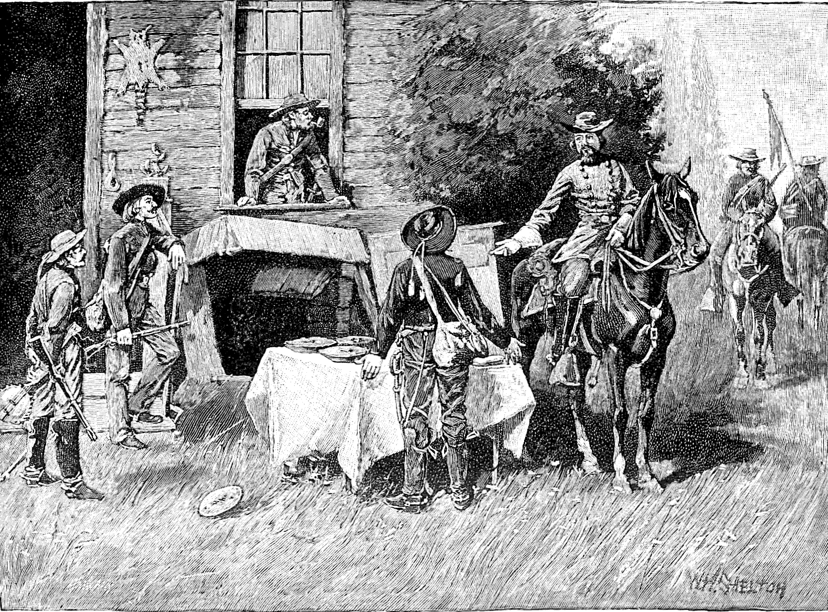 After breakfast next day, Tom, with his rifle, led us by a back road to the house of "'Squire Larkin C. Hooper," a leading loyalist, whom we met on the way, and together we proceeded to his house. Ragged and forlorn, we were eagerly welcomed at his home by Hooper's invalid wife and daughters. For several days we enjoyed a hospitality given as freely to utter strangers as if we had been relatives of the family.
