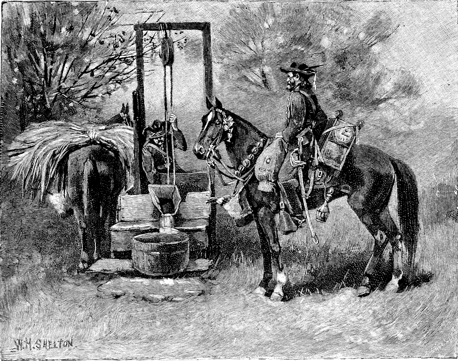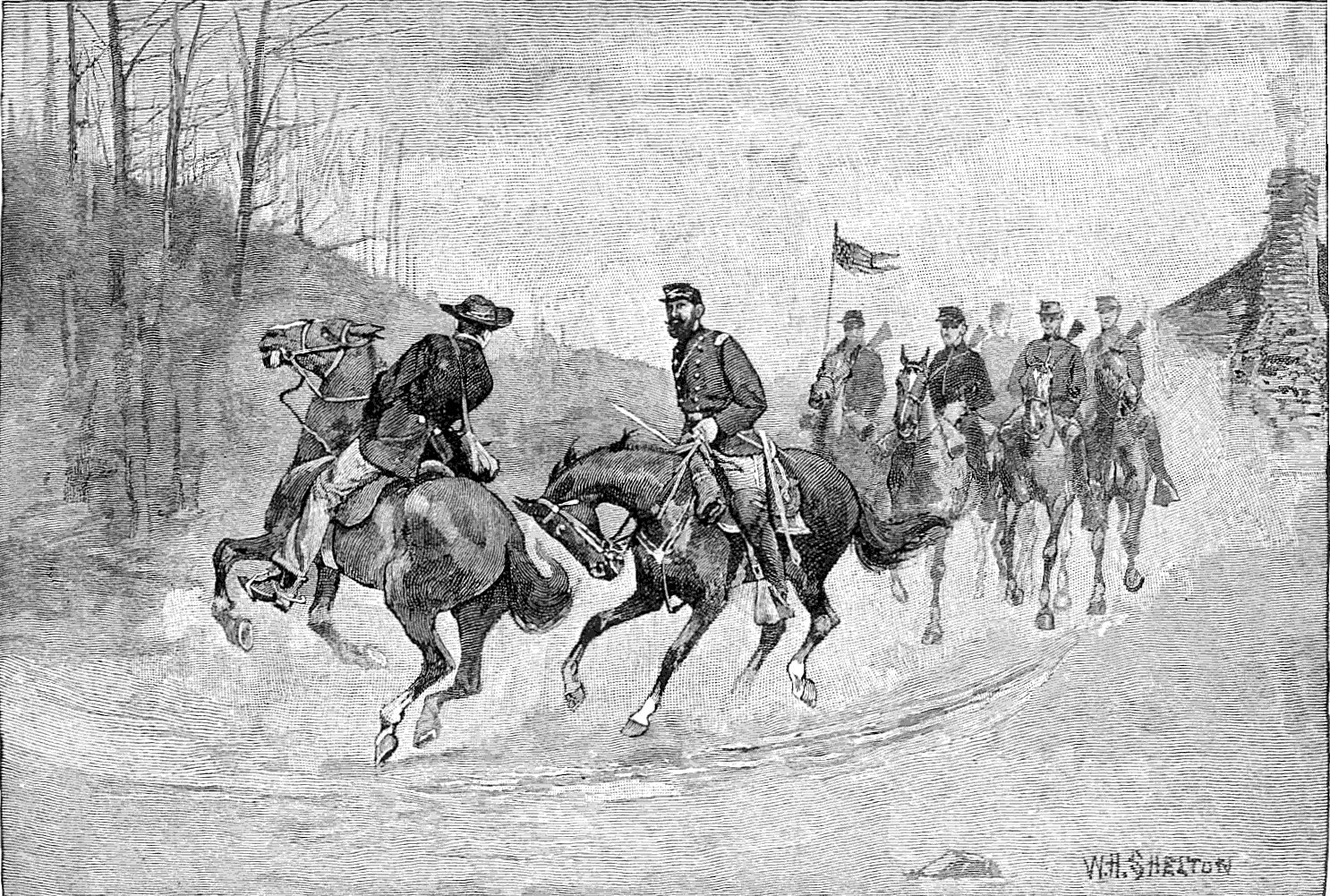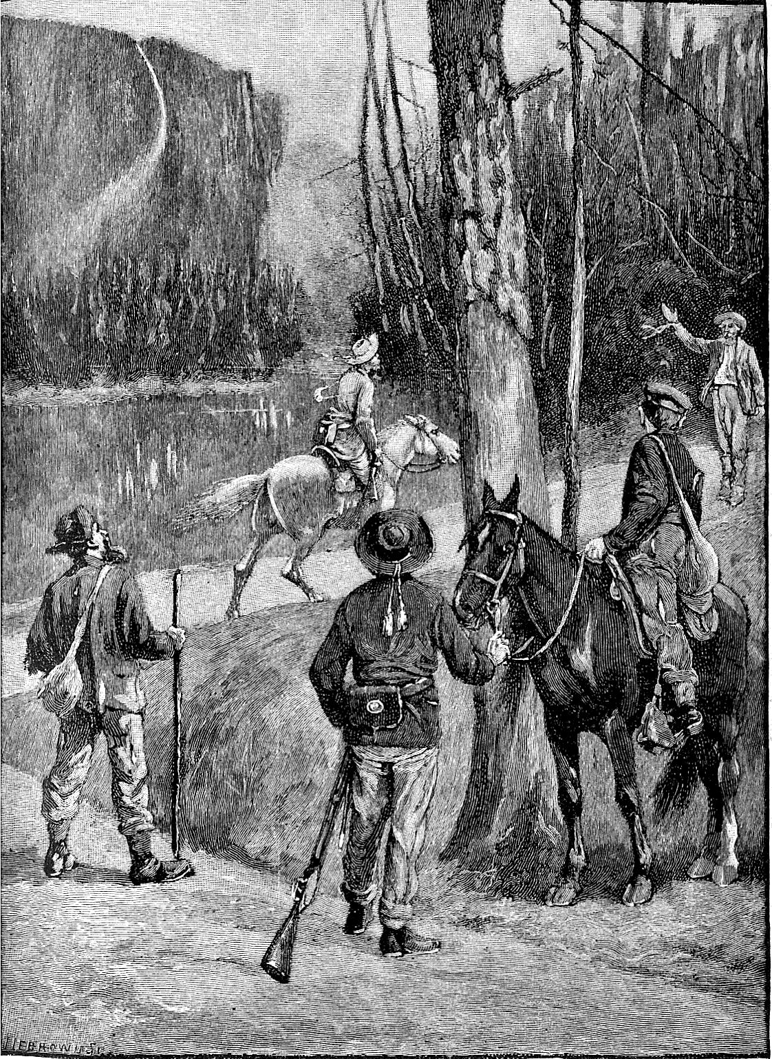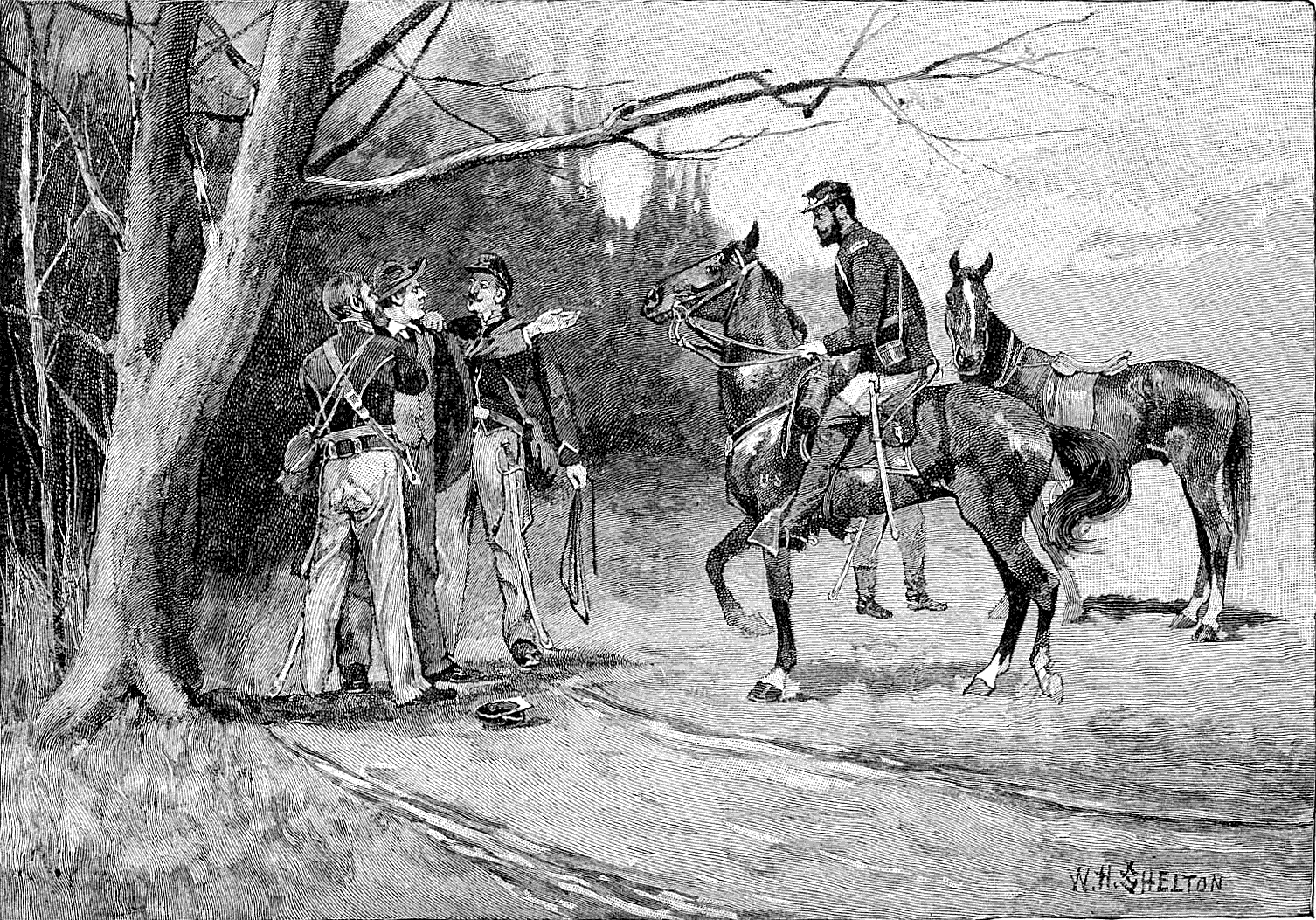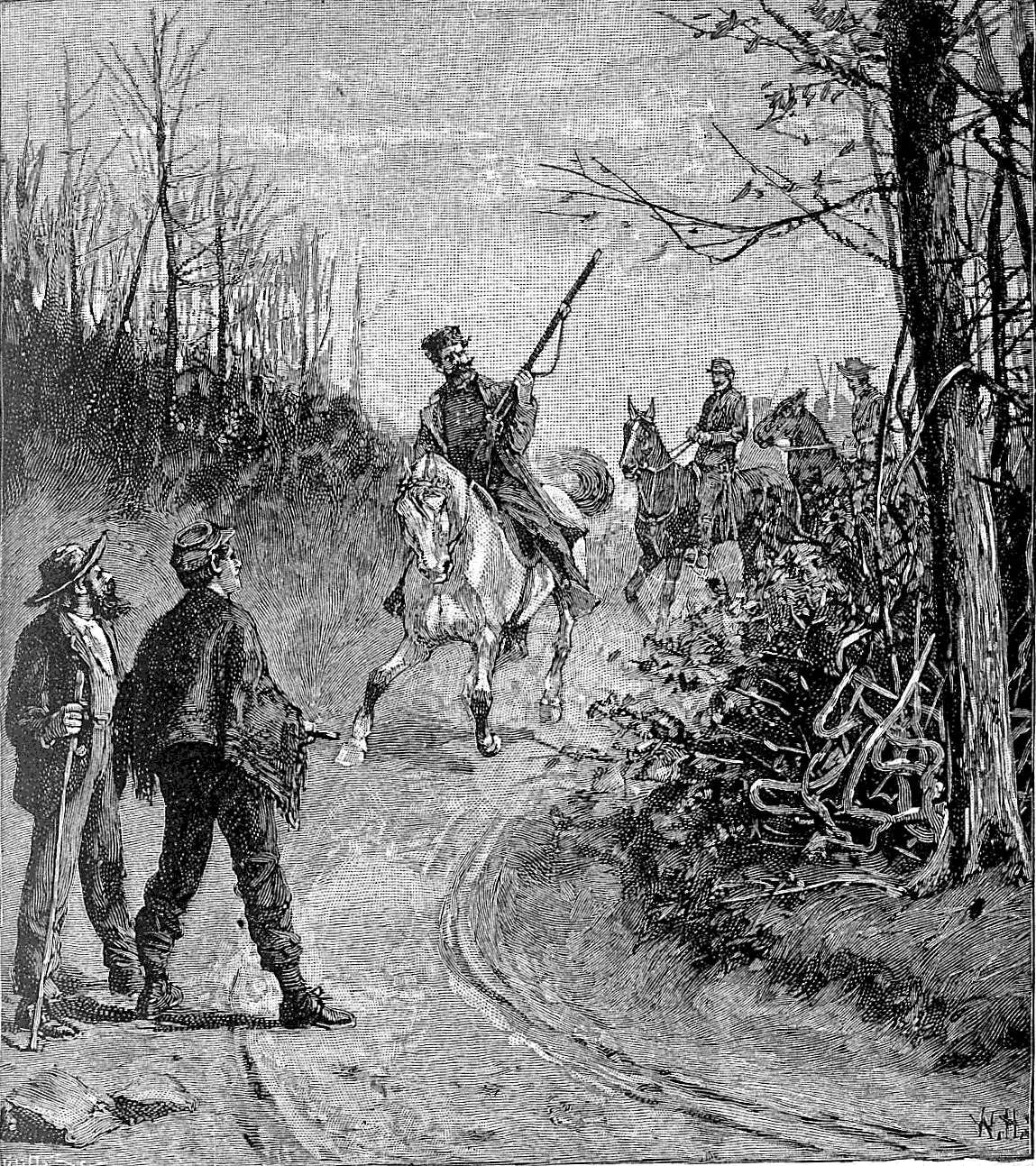 For half a mile the road ran along the bank of the river, and then turned around a wooded bluff to the right. Opposite this bluff and accessible by a shallow ford was another hill, where it was feared that some of the Rangers were still lingering about their camp. As we came to the turn in the road our company was walking rapidly in Indian file, guide Edmonston and I at the front. Coming around the bluff from the opposite direction was a countryman mounted on a powerful gray mare. His overcoat was army blue, but he wore a bristling fur cap, and his rifle was slung on his back. At sight of us he turned in his saddle to shout to some one behind, and bringing his gun to bear came tearing and swearing down the road, spattering the gravel under the big hoofs of the gray. Close at his heels rode two officers in Confederate gray uniforms, and a motley crowd of riders closed up the road behind. In an instant the guide and I were surrounded, the whole cavalcade leveling their guns at the thicket and calling on our companions, who could be plainly heard crashing through the bushes, to halt. The dress of but few of our captors could be seen, nearly all being covered with rubber talmas; but their mounts, including mules as well as horses, were equipped with every variety of bridle and saddle to be imagined. I knew at a glance that this was no body of our cavalry. If we were in the hands of the Rangers, the fate of the guides and refugees would be the hardest. I thought they might spare the lives of the officers. "Who are you? What are you doing here?" demanded the commander, riding up to us and scrutinizing our rags. I hesitated a moment, and then, throwing off the blanket I wore over my shoulders, simply said, "You can see what I am." My rags were the rags of a uniform, and spoke for themselves.