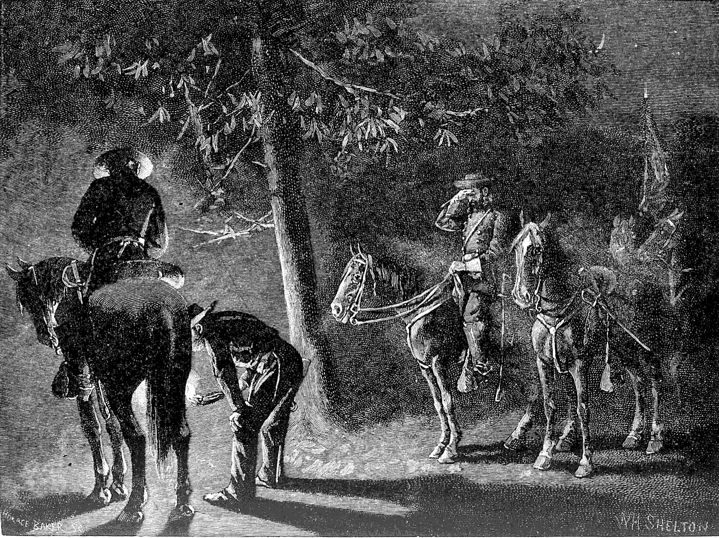 Creeping a little farther into the swamp, I lay concealed for about three hours in the most painful position, sometimes moving a few yards almost ventre à terre to escape notice; for I was within hearing of the camps on each side of the stream, and often when the soldiers came down for water, or to water their horses, I was within a few yards of them. Some two hours or more passed thus before the party moved. The wagons left first, then the bugles sounded, and the president started on one of his carriage-horses, followed by his staff and a squadron of the enemy. Shortly after their departure I saw some one leading two abandoned horses into the swamp, and recognized Lieutenant Barnwell of our escort. Secreting the horses, we picked up from the debris of the camp parts of two saddles and bridles, and with some patching and tying fitted out our horses, as sad and war-worn animals as ever man bestrode. Though hungry and tired, we gave the remains of the camp provisions to a Mr. Fenn for dinner. He recommended us to Widow Paulk's, ten miles distant, an old lady rich in cattle alone.