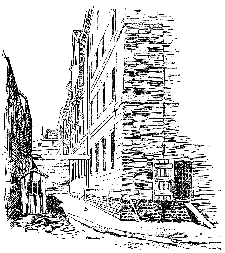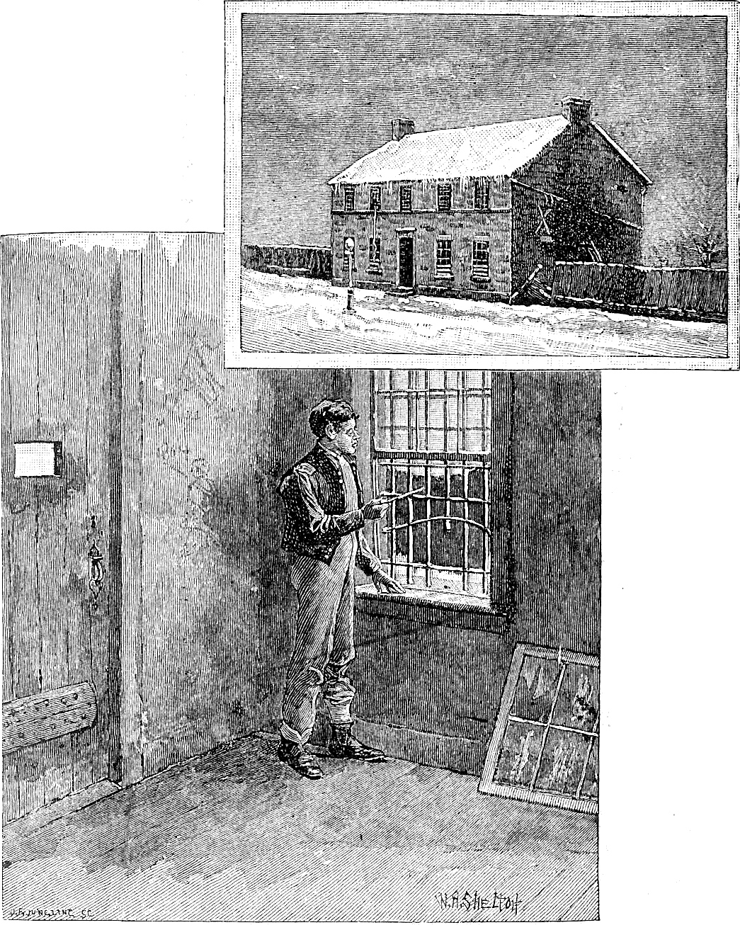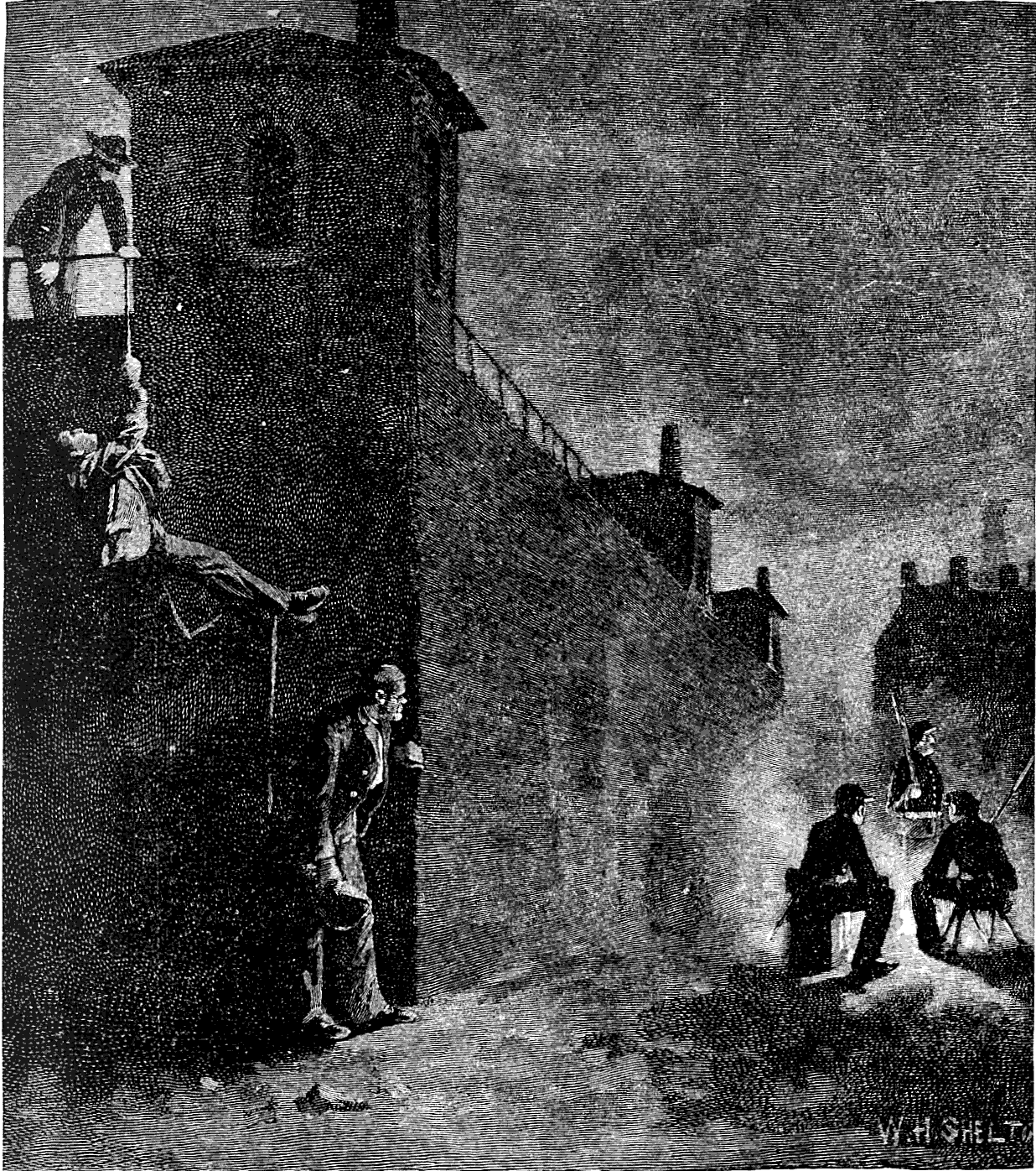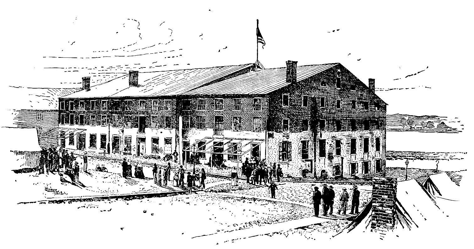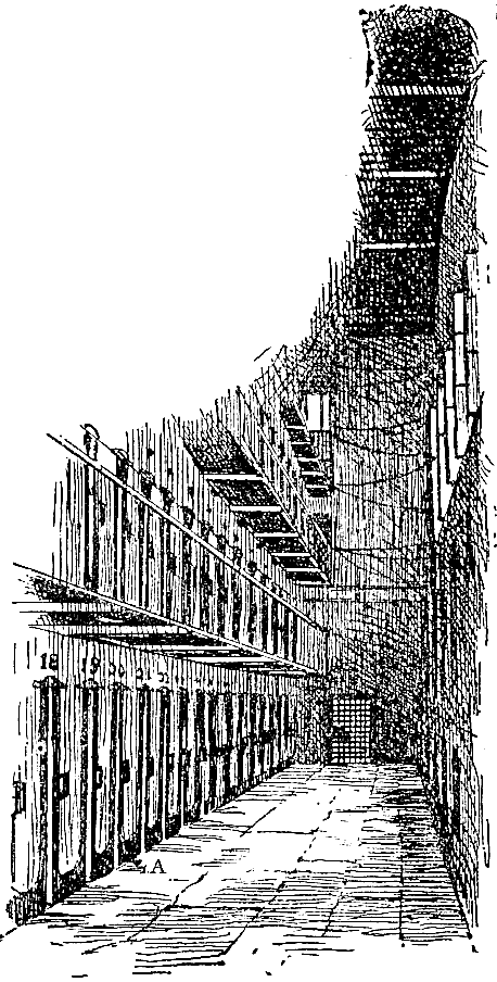 At Greenville we were lodged in the county jail to await the reconstruction of railway-bridges, when we were to be transported to Columbia. The jail was a stone structure, two stories in height, with halls through the center on both floors and square rooms on each side. The lock was turned on our little party of six in one of these upper rooms, having two grated windows looking down on the walk. Through the door which opened on the hall a square hole was cut as high as one's face and large enough to admit the passage of a plate. Aside from the rigor of our confinement we were treated with marked kindness. We had scarcely walked about our dungeon before the jailer's daughters were at the door with their autograph albums. In a few days we were playing draughts and reading Bulwer, while the girls, without, were preparing our food and knitting for us warm new stockings. Notwithstanding all these attentions, we were ungratefully discontented. At the end of the first week we were joined by seven enlisted men, Ohio boys, who like ourselves had been found at large in the mountains. From one of these new arrivals we procured a case-knife and a gun screw-driver. Down on the hearth before the fire the screw-driver was placed on the thick edge of the knife and belabored with a beef bone until a few inches of its back were converted into a rude saw. The grate in the window was formed of cast-iron bars, passing perpendicularly through wrought-iron plates, bedded in the stone jambs. If one of these perpendicular bars, an inch and a half square, could be cut through, the plates might be easily bent so as to permit the egress of a man. With this end in view we cautiously began operations. Outside of the bars a piece of carpet had been stretched to keep out the raw wind, and behind this we worked with safety. An hour's toil produced but a few feathery filings on the horizontal plate, but many hands make light work, and steadily the cut grew deeper. We recalled the adventures of Claude Duval, Dick Turpin, and Sixteen-string Jack, and sawed away. During the available hours of three days and throughout one entire night the blade of steel was worrying, rasping, eating the iron bar. At last the grosser yielded to the temper and persistence of the finer metal. It was Saturday night when the toilsome cut was completed, and preparations were already under way for a speedy departure. The jail had always been regarded as too secure to require a military guard, although soldiers were quartered in the town; besides, the night was so cold that a crust had formed on the snow, and both citizens and soldiers, unused to such extreme weather would be likely to remain indoors. For greater secrecy of movement, we divided into small parties, aiming to traverse different roads. I was to go with my former companion, Captain Smith. Lots were cast to determine the order of our going. First exit was allotted to four of the Ohio soldiers. Made fast to the grating outside were a bit of rope and strip of blanket, along which to descend. Our room was immediately over that of the jailer and his sleeping family, and beneath our opening was a window, which each man must pass in his descent. At eleven o'clock the exodus began. The first man was passed through the bars amid a suppressed buzz of whispered cautions. His boots were handed after him in a haversack. The rest of us, pressing our faces to the frosty grating, listened breathlessly for the success of the movement we could no longer see. Suddenly there was a crash, and in the midst of mutterings of anger we snatched in the rag ladder and restored the piece of carpeting to its place outside the bars. Our pioneer had hurt his hand against the rough stones, and, floundering in mid-air, had dashed his leg through sash and glass of the window below. We could see nothing of his further movements, but soon discovered the jailer standing in the door, looking up and down the street, seemingly in the dark as to where the crash came from. At last, wearied and worried and disappointed, we lay down in our blankets upon the hard floor.