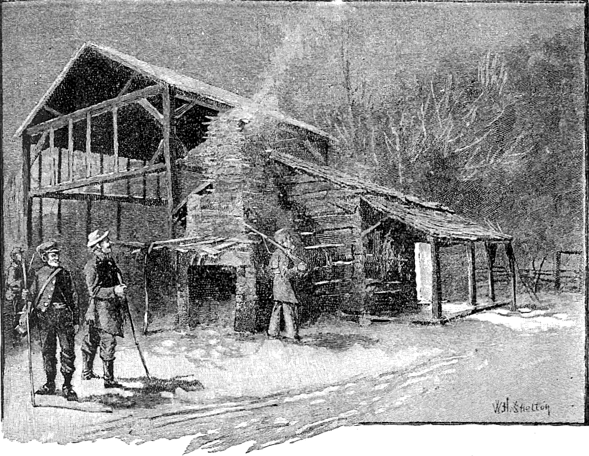 Early in the morning of the fourth day our little party was assembled upon the last mountain overlooking the open country of East Tennessee. Some of us had been wandering in the mountains for the whole winter. We were returning to a half-forgotten world of farms and fences, roads and railways. Below us stretched the Tellico River away toward the line of towns marking the course of the Nashville and Chattanooga Railroad. One of the guides who had ventured down to the nearest house returned with information that the four hundred Texan Rangers had burned the depot at Philadelphia Station the day before, but were now thought to be out of the country. We could see the distant smoke arising from the ruins. Where the river flowed out of the mountains were extensive iron-works, the property of a loyal citizen, and in front of his house we halted for consultation. He regretted that we had shown ourselves so soon, as the rear-guard of the marauders had passed the night within sight of where we now stood. Our nearest pickets were at Loudon, thirty miles distant on the railway, and for this station we were advised to make all speed.