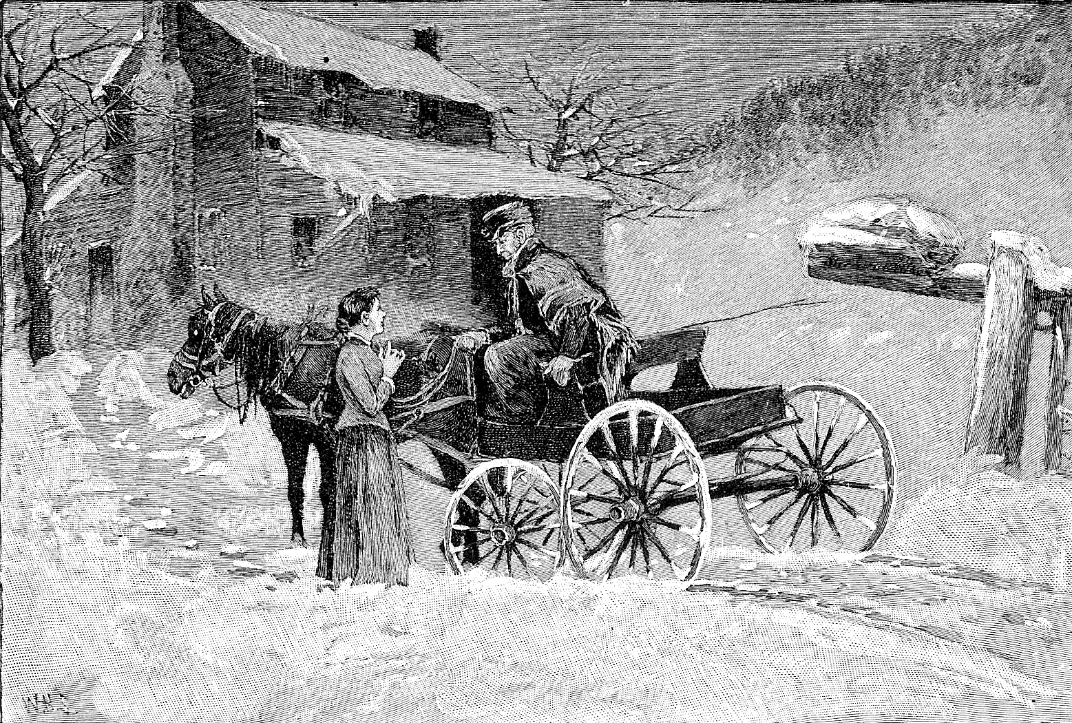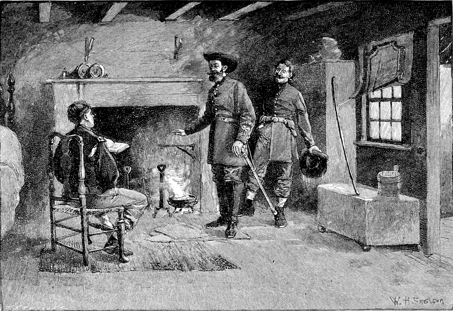 I restrained my eagerness to be going until Monday night, the time agreed upon, when, my disabled companion not putting in an appearance, I set out for my old friend's in Casher's Valley. I got safety over a long wooden bridge within half a mile of a garrisoned town. I left the road, and turned, as I believed, away from the town; but I was absolutely lost in the darkness of a snow-storm, and forced to seek counsel as well as shelter. In this plight I pressed on toward a light glimmering faintly through the blinding snow. It led me into the shelter of the porch to a small brown house, cut deeply beneath the low eaves, and protected at the sides by flanking bedrooms. My knock was answered by a girlish voice, and from the ensuing parley, through the closed door, I learned that she was the daughter of a Baptist exhorter, and that she was alone in the house, her brother being away at the village, and her father, who preached the day before at some distance, not being expected home until the next morning. Reassured by my civil-toned inquiries about the road, she unfastened the door and came out to the porch, where she proceeded to instruct me how to go on, which was just the thing I least desired to do. By this time I had discovered the political complexion of the family, and, making myself known, was instantly invited in, with the assurance that her father would be gravely displeased if she permitted me to go on before he returned. I had interrupted my little benefactress in the act of writing a letter, on a sheet of foolscap which lay on an old-fashioned stand in one corner of the room, beside the ink-bottle and the candlestick. In the diagonal corner stood a tall bookcase, the crowded volumes nestling lovingly behind the glass doors—the only collection of the sort that I saw at any time in the mountains. A feather-bed was spread upon the floor, the head raised by means of a turned-down chair, and here I was reposing comfortably when the brother arrived. It was late in the forenoon when the minister reached home, his rickety wagon creaking through the snow, and drawn at a snail's pace by a long-furred, knock-kneed horse. The tall but not very clerical figure was wrapped in a shawl and swathed round the throat with many turns of a woolen tippet. The daughter ran out with eagerness to greet her father and tell of the wonderful arrival. I was received with genuine delight. It was the enthusiasm of a patriot eager to find a sympathetic ear for his long-repressed views.[20]