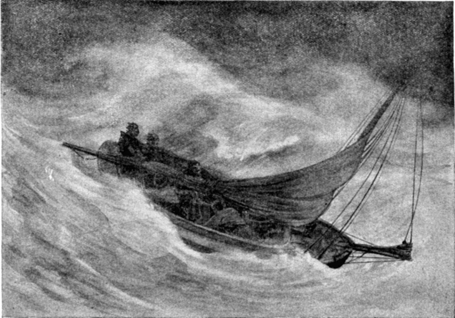 By noon the next day the weather had moderated sufficiently to make more sail, and the sea went down at the same time. Then, hungry and thirsty, Tom was thought of. During the gale he had remained in the bottom of the boat as motionless as a log. As he was roused up, he asked: