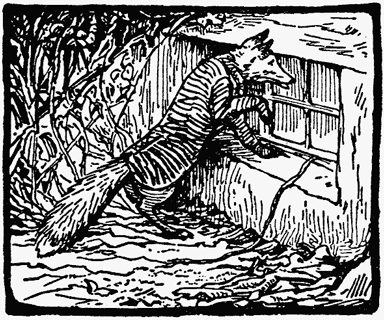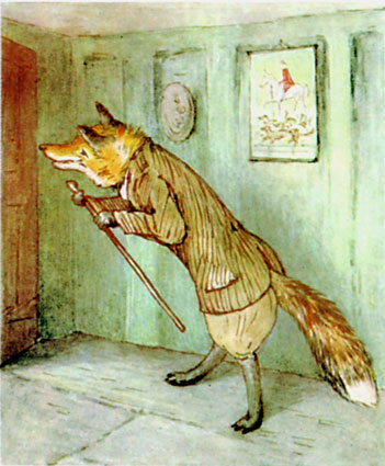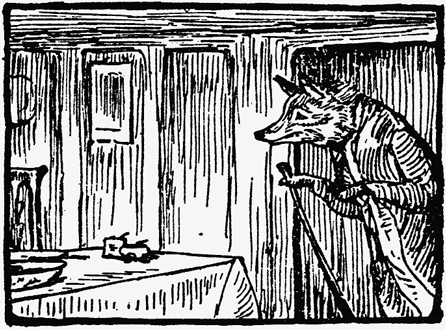For the next twenty minutes Mr. Tod kept creeping cautiously into the house, and retreating hurriedly out again. By degrees he ventured further in—right into the bedroom. When he was outside the house, he scratched up the earth with fury. But when he was inside—he did not like the look of Tommy Brock's teeth.