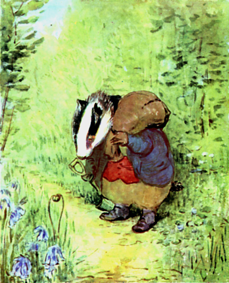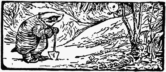 He sat in the sun, and conversed cordially with Tommy Brock, who was passing through the wood with a sack and a little spud which he used for digging, and some mole traps. He complained bitterly about the[Pg 14][Pg 13][Pg 12] scarcity of pheasants' eggs, and accused Mr. Tod of poaching them. And the otters had cleared off all the frogs while he was asleep in winter—"I have not had a good square meal for a fortnight, I am living on pig-nuts. I shall have to turn vegetarian and eat my own tail!" said Tommy Brock.