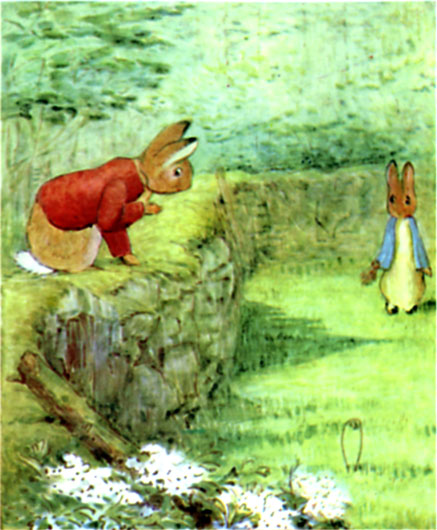 Benjamin climbed over the wall, into a meadow. He found another mole trap newly set; he was still upon the track of Tommy Brock. It was getting late in the afternoon. Other rabbits were coming out to enjoy the evening air. One of them in a blue coat by himself, was busily hunting for dandelions.—"Cousin Peter! Peter Rabbit, Peter Rabbit!" shouted Benjamin Bunny.