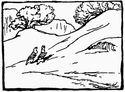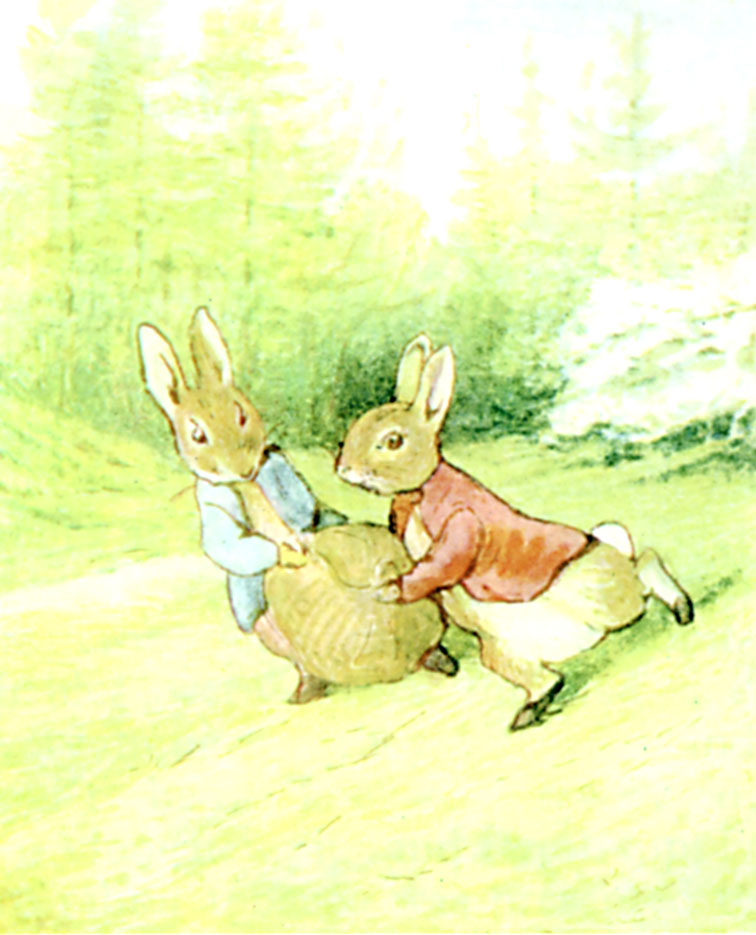 Five minutes afterwards two breathless rabbits came scuttering away down Bull Banks, half carrying half dragging a sack between them, bumpetty bump over the grass. They reached home safely and burst into the rabbit hole.[Pg 90]