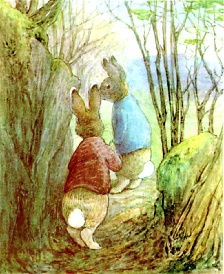 As soon as the coast was clear, Peter Rabbit and Benjamin Bunny came out of the bushes—
